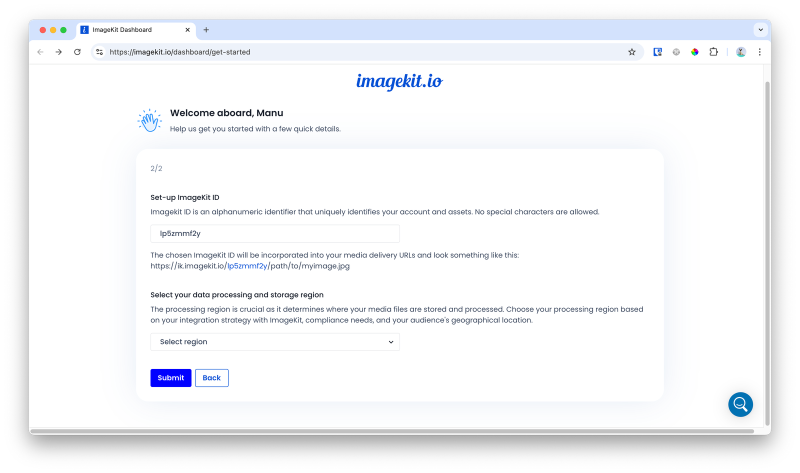 In the next step, you will be prompted to select an ImageKit ID and a processing region during the account setup process.
